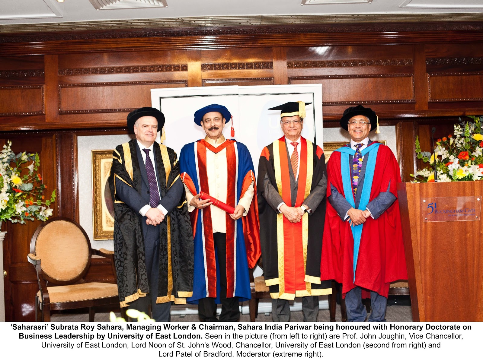 London, July 09, 2013: In a special ceremony of the University of East London on Sunday, at the Crowne Plaza Hotel in central London, before an audience consisting of University of East London (UEL) staff, governors and students; and a number of distinguished guests from industry, political life and sport along with members of Sahara family, Saharasri Subrata Roy Sahara, Managing Worker & Chairman, Sahara India Pariwar, has being conferred with the award of Doctor of Business honoris causa.